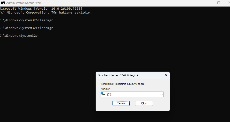 2.Yöntem: Windows işletim sistemi kurulu bilgisayarınızda cmd’yi Administrator olarak çalıştırın. Gereksiz dosyaları silecek.