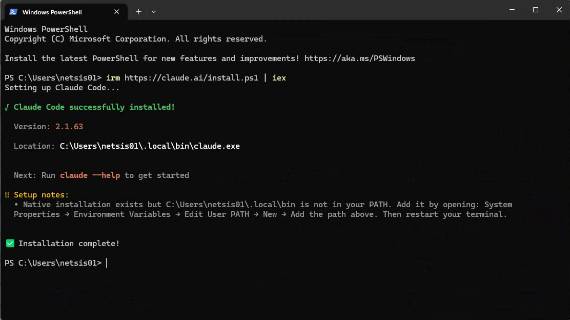 Kurulum başarılı bir şekilde gerçekleştikten sonra Ortam Değişkenlerinden Path kısmına C:\Users\netsis01\.local\bin ekledikten sonra